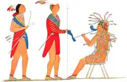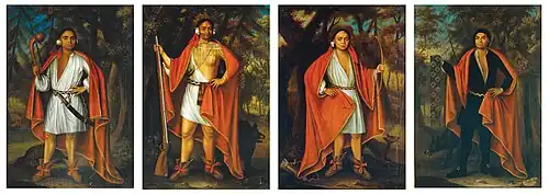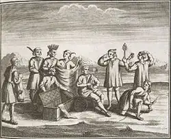 Eighteenth-century English historiography focuses on the diplomatic relations with the Iroquois, supplemented by such images as John Verelst's Four Mohawk Kings, and publications such as the Anglo-Iroquoian treaty proceedings printed by Benjamin Franklin.[52] A persistent 19th and 20th century narrative casts the Iroquois as "an expansive military and political power ... [who] subjugated their enemies by violent force and for almost two centuries acted as the fulcrum in the balance of power in colonial North America".[53]