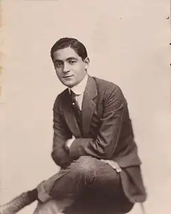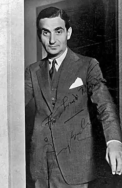 Born in Russia, Berlin arrived in the United States at the age of five. His family left Russia to escape pogroms against the Jewish village of Tolochin.[4][5] He published his first song, "Marie from Sunny Italy", in 1907, receiving 33 cents for the publishing rights,[6] and became known as the composer of numerous international hits, starting with 1911's "Alexander's Ragtime Band". He also was an owner of the Music Box Theatre on Broadway. For much of his career, Berlin could not read sheet music, and was such a limited piano player that he could only play in the key of F-sharp; he used his custom piano equipped with a transposing lever when he needed to play in keys other than F-sharp.[7] He was known for writing music and lyrics in the American vernacular: uncomplicated, simple and direct, with his stated aim being to "reach the heart of the average American", whom he saw as the "real soul of the country".[8]