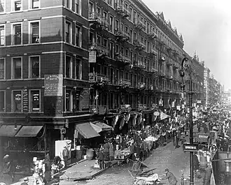 Having left school around the age of thirteen,[13] Berlin had few survival skills and realized that formal employment was out of the question. His only ability was acquired from his father's vocation as a singer, and he joined with several other youngsters who went to saloons on the Bowery and sang to customers. Itinerant young singers like them were common on the Lower East Side. Berlin would sing a few of the popular ballads he heard on the street, hoping people would pitch him a few pennies. From these seamy surroundings, he became streetwise, with real and lasting education. Music was his only source of income, and he picked up the language and culture of the ghetto lifestyle.[22]