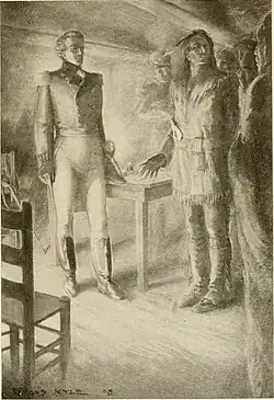 The victory solidified the support of Tecumseh and other Indigenous leaders, who saw Brock's actions as both a sign of competence and a willingness to take action.[35] Tecumseh trusted and respected Brock, and is reported to have proclaimed, "This is a man," after meeting the general for the first time.[36] Although Brock's correspondence indicates a certain amount of paternal condescension for the First Nations,[37] he seems to have regarded Tecumseh very highly saying, "a more sagacious or a more gallant warrior does not I believe exist".[38] Brock made a number of commitments to the Shawnee leader. He promised not to broker a peace treaty with the Americans without addressing Tecumseh's vision of an independent homeland. There is no evidence Brock negotiated in bad faith. His personal integrity and respect for Indigenous peoples suggests that if he had lived he would have kept his word to the Shawnee leader.[39]