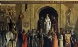 However, Henry hesitated to fulfill all of the magnates' wishes, especially with regards to government reform, causing relations to sour.[18] In February 1465, he renounced Alfonso as his heir and commanded Beltrán to mobilize a royal army.[19] Civil war broke out in June 1465 after Carrillo, Pacheco, and other agitators conducted a ceremonial deposition-in-effigy of Henry outside the city of Avila and crowned Alfonso as a rival king.[20][21] In 1467, the nobles clashed with Henry's forces at the Second Battle of Olmedo, which concluded as a draw.[22] A month after the battle, rebels liberated Isabella from Henry's control and she returned to Arévalo to tend to her mother. Regarding his younger half-sister as a neutral party in the civil war, Henry decreed in November that Isabella could travel freely.[23] Alfonso eventually joined his mother and sister in Arévalo and, in a document he signed as "King of Castile and León" on 8 December 1467, awarded Isabella the town of Medina del Campo.[24]