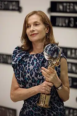 She is also one of only four women who have twice received the Volpi Cup for Best Actress at the Venice Film Festival: in 1988 for her part in Une affaire de femmes (tied with Shirley MacLaine), and in 1995 for La Cérémonie (tied with her partner in the movie, Sandrine Bonnaire).[58] Both films were directed by Claude Chabrol. Additionally, she received a Special Lion in 2005 for her role in Gabrielle.[59] Huppert was twice voted Best Actress at the European Film Awards: in 2001 for playing Erika Kohut in The Piano Teacher, and in 2002 with the entire cast of 8 Women (directed by François Ozon).[29] The latter cast also won a Silver Bear for Outstanding Artistic Contribution, at the 2002 Berlin International Film Festival.[60] Huppert won the Golden Globe Award for Best Actress in a Motion Picture – Drama[61] and received her first nomination for the Academy Award for Best Actress for her work in Elle.[62]