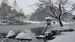 ![]() Kenroku-en Landscape Garden in Kanazawa City, Ishikawa Prefecture. The pine trees are covered by the yukitsuri, preventing them from falling in winter when it snows heavily. | |