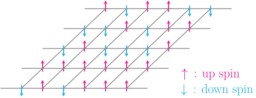 Consider a set of lattice sites, each with a set of adjacent sites (e.g. a graph) forming a -dimensional lattice. For each lattice site there is a discrete variable such that , representing the site's spin. A spin configuration, is an assignment of spin value to each lattice site.