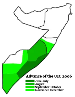 The Islamic Courts Union (Somali: Midowga Maxkamadaha Islaamiga) was a legal and political organization founded by Mogadishu-based Sharia courts during the early 2000s to combat the lawlessness stemming from the Somali Civil War. By mid-to-late 2006, the Islamic Courts had expanded their influence to become the de facto government in most of southern and central Somalia,[2] succeeding in creating the first semblance of a state since 1991.[3]