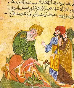An Arabic manuscript from the 13th century depicting Socrates (Soqrāt) in discussion with his pupils