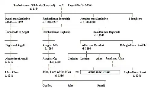 There is evidence of another kin group on Islay – the Cenél Conchride, supposedly descended from a brother of the legendary founder of Dál Riata, king Fergus Mór, but the existence of the Cenél Conchride seems to have been brief and the 430 households of the island are later said to have been comprised from the families of just three great-grandsons of the eponymous founder of Cenél nÓengus: Lugaid, Connal and Galán.[66]