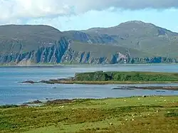 Islay is 40 kilometres (25 mi) long from north to south and 24 kilometres (15 mi) broad. The east coast is rugged and mountainous, rising steeply from the Sound of Islay, the highest peak being Beinn Bheigier, which is a Marilyn at 1,612 feet (491 m). The western peninsulas are separated from the main bulk of the island by the waters of Loch Indaal to the south and Loch Gruinart to the north.[28] The fertile and windswept southwestern arm is called The Rinns, and Ardnave Point is a conspicuous promontory on the northwest coast. The south coast is sheltered from the prevailing winds and, as a result, relatively wooded.[29][30][31] The fractal coast has numerous bays and sea lochs, including Loch an t-Sailein, Aros Bay and Claggain Bay.[29] In the far southwest is a rocky and now largely uninhabited peninsula called The Oa, the closest point in the Hebrides to Ireland.[32]