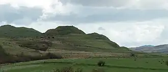 The most spectacular prehistoric structure on the island is Dun Nosebridge. This 375-square-metre (4,040 sq ft) Iron Age fort occupies a prominent crag and has commanding views of the surrounding landscape. The name's origin is probably a mixture of Gaelic and Old Norse: Dun in the former language means "fort" and knaus-borg in the latter means "fort on the crag".[61] There is no evidence that Islay was ever subject to Roman military control although small numbers of finds such as a coin and a brooch from the third century AD suggest links of some kind with the intermittent Roman presence on the mainland.[62] The ruins of a broch at Dùn Bhoraraic south east of Ballygrant and the remains of numerous Atlantic roundhouses indicate the influences of northern Scotland, where these forms of building originate.[63][64] There are also various crannogs on Islay, including sites in Loch Ardnave, Loch Ballygrant and Loch Allallaidh in the south east where a stone causeway leading out to two adjacent islands is visible beneath the surface of the water.[29][63]