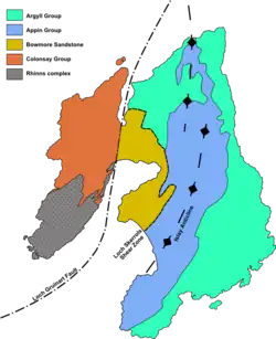 Loch Indaal was formed along a branch of the Great Glen Fault called the Loch Gruinart Fault; its main line passes just to the north of Colonsay. This separates the limestone, igneous intrusions and Bowmore sandstones from the Colonsay Group rocks of the Rhinns.[40] The result is occasional minor earth tremors.[41]