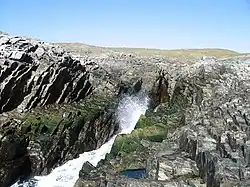 The underlying geology of Islay is intricate for such a small area.[3] The deformed Palaeoproterozoic igneous rock of the Rhinns complex is dominated by a coarse-grained gneiss cut by large intrusions of deformed gabbro. Once thought to be part of the Lewisian complex, it lies beneath the Colonsay Group of metasedimentary rocks[34][35] that forms the bedrock at the northern end of the Rinns. It is a quartz-rich metamorphic marine sandstone that may be unique to Scotland and which is nearly 5,000 m (16,400 ft) thick.[36] South of Rubh' a' Mhail there are outcrops of quartzite, and a strip of mica schist and limestone cuts across the centre of the island from The Oa to Port Askaig. Further south is a band of metamorphic quartzite and granites, a continuation of the beds that underlie Jura. The geomorphology of these last two zones is dominated by a fold known as the Islay Anticline. To the south is a "shattered coastline" formed from mica schist and hornblende.[3][37][38] The older Bowmore Group sandstones in the west centre of the island are rich in feldspar and may be of Dalradian origin.[39][Note 4]