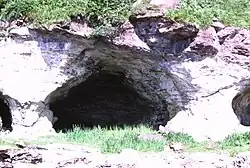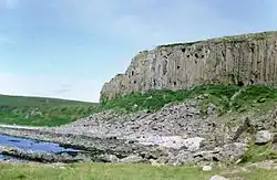 The Pleistocene glaciations almost entirely covered Scotland in ice, and Arran's highest peaks may have been nunataks at this time.[21] After the last retreat of the ice at the close of the Pleistocene epoch sea levels were up to 70 metres (230 ft) lower than at present and it is likely that circa 14,000 BP the island was connected to mainland Scotland.[29] Sea level changes and the isostatic rise of land makes charting post-glacial coastlines a complex task, but it is evident that the island is ringed by post glacial raised beaches.[30] King's Cave on the south west coast is an example of an emergent landform on such a raised beach. This cave, which is over 30.5 metres (100 ft) long and up to 15.3 metres (50 ft) high, lies well above the present day sea level.[31][32][33] There are tall sea cliffs to the north east including large rock slides under the heights of Torr Reamhar, Torr Meadhonach and at Scriden (An Scriodan) at the far north end of the island.[19][34][35]