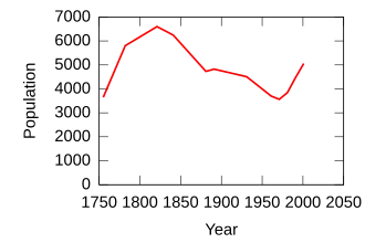 Arran's resident population was 4,629 in 2011, a decline of over 8 per cent from the 5,045 recorded in 2001,[62] against a background of Scottish island populations as a whole growing by 4 per cent to 103,702 over the same period.[63]