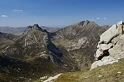 The largest glen on the island is Glen Iorsa to the west, whilst narrow Glen Sannox (Gaelic: Gleann Shannaig) and Glen Rosa (Gaelic: Gleann Ròsa) to the east surround Goat Fell. The terrain to the south is less mountainous, although a considerable portion of the interior lies above 350 metres (1,150 ft), and A' Chruach reaches 512.5 metres (1,681 ft) at its summit.[18][19] There are two other Marilyns in the south, Tighvein and Mullach Mòr (Holy Island).