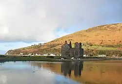 On the opposite side of the island near Blackwaterfoot is the King's Cave where Robert the Bruce is said to have taken shelter in the 14th century.[52] Bruce returned to the island in 1326, having earlier granted lands to Fergus MacLouis for assistance rendered during his time of concealment there. Brodick Castle played a prominent part in the island's medieval history. Probably dating from the 13th century, it was captured by English forces during the Wars of Independence before being taken back by Scottish troops in 1307. It was badly damaged by action from English ships in 1406 and sustained an attack by John of Islay, the Lord of the Isles in 1455. Originally a seat of the Clan Stewart of Menteith it passed to the Boyd family in the 15th century.[53][54] For a short time during the reign of King James V in the 16th century, the Isle of Arran was under the regency of Robert Maxwell, 5th Lord Maxwell.[55]