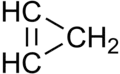 In two of the isomers, the three carbon atoms are connected in an open chain, but in one of them (propadiene or allene; I) the carbons are connected by two double bonds, while in the other (propyne or methylacetylene; II) they are connected by a single bond and a triple bond. In the third isomer (cyclopropene; III) the three carbons are connected into a ring by two single bonds and a double bond. In all three, the remaining valences of the carbon atoms are satisfied by the four hydrogens.
