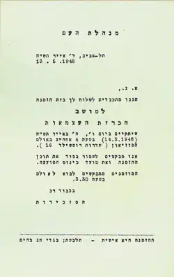 2. ^ "The Declaration Scroll". Independence Hall of Israel. 2013. Archived from the original on 26 April 2019. Retrieved 25 April 2023.