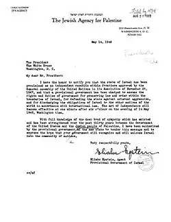 1. ^ a b "Zionists Proclaim New State of Israel; Truman Recognizes it and Hopes for Peace" The New York Times, 15 May 1948