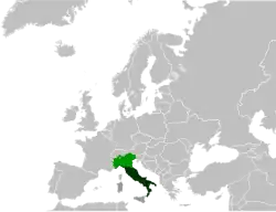 Minimum extent (excluding Northern Italy) of the Italian peninsula in dark green and maximum extent (including Northern Italy) in light green