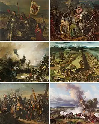 A French army defeated the Spanish at Ravenna on 11 April 1512, but their leader Gaston de Foix was killed, while the Swiss recaptured Milan and restored Ludovico's son Massimiliano Sforza as duke.[41] The members of the League then fell out over dividing the spoils and the death of Pope Julius on 20 February 1513 left it without effective leadership.[42] In March, Venice and France formed an alliance, but from June to September 1513 the League won victories at Novara and La Motta in Lombardy, Guinegate in Flanders and Flodden in England. Despite this, fighting continued in Italy, with neither side able to gain a decisive advantage.[43]