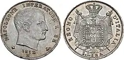 The Napoleonic Kingdom of Italy issued coins between 1807 and 1813 in denominations of 1 and 3 centesimi and 1 soldo (5 centesimi) in copper, c.10 in 20% silver alloy, s.5, s.10 and s.15 (or c.25, c.50 and c.75 centesimi), 1 lira, 2 lire and 5 lire in 90% silver and 20 lire and 40 lire in 90% gold. All except the c.10 bore a portrait of Napoleon I, with the denominations below 1 lira also showing a radiate crown and the higher denominations, a shield representing the various constituent territories of the Kingdom.