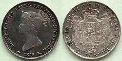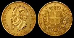 After the end of the Napoleonic Kingdom of Italy in 1814, the lira remained present only in the Duchy of Parma and the Kingdom of Piedmont-Sardinia. The lira of Parma was introduced by Duchess Marie Louise, Duchess of Parma, who issued coin denominations of 1, 3, 5, 25, 50 cents and 1, 2, 5, 20 and 40 lire,[14] while gold coins of 10, 50, 80 and 100 lire were also minted from the Piedmont-Sardinia lira introduced by Victor Emmanuel I of Savoy.[15]