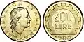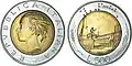 In 1977, aluminium-bronze 200 L. coins were introduced, followed in 1982 by the bimetallic 500 L.. This was the first bi-metallic coin to be produced for circulation, minted using a system patented by IPZS. It was also the first to feature the value in braille.[16]