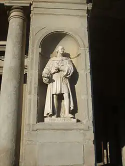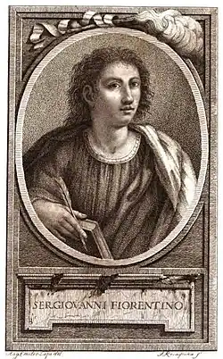 The development of drama in the 15th century was very great.[93] This type of semi-popular literature was born in Florence, and attached itself to certain popular festivities that were usually held in honor of St John the Baptist, patron saint of the city. The Sacra Rappresentazione is the development of the medieval Mistero (mystery play). Although it belonged to popular poetry, some of its authors were literary men. From the 15th century, some element of the comic-profane found its way into the Sacra Rappresentazione.[94] From its Biblical and legendary conventionalism Poliziano emancipated himself in his Orfeo, which, although in its exterior form belonging to the sacred representations, yet substantially detaches itself from them in its contents and in the artistic element introduced.[84]