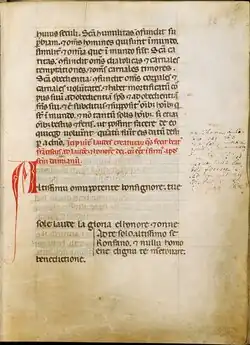 Jacopone da Todi was a poet who represented the religious feeling that had made special progress in Umbria. Jacopone was possessed by St. Francis's mysticism, but was also a satirist who mocked the corruption and hypocrisy of the Church.[26] The religious movement in Umbria was followed by another literary phenomenon, the religious drama. In 1258 a hermit, Raniero Fasani, represented himself as sent by God to disclose mysterious visions, and to announce to the world terrible visitations.[27] Fasani's pronouncements stimulated the formation of the Compagnie di Disciplinanti, who, for a penance, scourged themselves until they drew blood, and sang Laudi in dialogue in their confraternities. These laudi, closely connected with the liturgy, were the first example of drama in the vernacular tongue of Italy. They were written in the Umbrian dialect, in verses of eight syllables. As early as the end of the 13th century the Devozioni del Giovedi e Venerdi Santo appeared, mixing liturgy and drama. Later, di un Monaco che andò al servizio di Dio ('of a monk who entered the service of God') approached the definite form the religious drama would assume in the following centuries.[24]