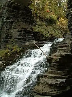 The valley in which Cayuga Lake is located is long and narrow with a north–south orientation. Ithaca is located at the southern end (the "head") of the lake, but the valley continues to the southwest behind the city. Originally a river valley, it was deepened and widened by the action of Pleistocene ice sheets over the last several hundred thousand years.[46] These ice sheets gouged the land crosswise to preexisting streams, producing hanging valleys. Once the last ice sheets receded — around twenty or thirty thousand years ago — these streams cut deep into the steep hillsides, forming the many distinctive gorges, rapids, and waterfalls seen in the region; examples include Fall and Cascadilla Creeks in Ithaca, and nearby Buttermilk Falls, Enfield Gorge, and Taughannock Falls.[46] Cayuga Lake is the most recent lake in a long series of lakes which developed as the ice retreated northward.[46] The lake drains to the north, and was formed behind a dam of glacial debris called a moraine.