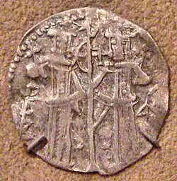 Ivan Alexander was the son of the Despot Sracimir of Kran by Petrica, a sister of Michael Asen III of Bulgaria.[8] Therefore, Ivan Alexander was a nephew of Michael Asen III.[5][6] Paternally, Ivan Alexander descended from the Asen dynasty.[5][6] By 1330 Ivan Alexander was a despot and governed the city of Lovech. Together with his father and his father-in-law Basarab of Wallachia, Ivan Alexander fought in the Battle of Velbazhd against the Serbs at modern-day Kyustendil in 1330, in which Bulgaria suffered a defeat. The defeat, combined with the worsening relations with the Byzantine Empire, precipitated an internal crisis, which was exacerbated by an invasion of the Byzantines. A coup d'état drove Ivan Stefan out of the capital Tarnovo in 1331, and the conspirators placed Ivan Alexander on the throne.[9]