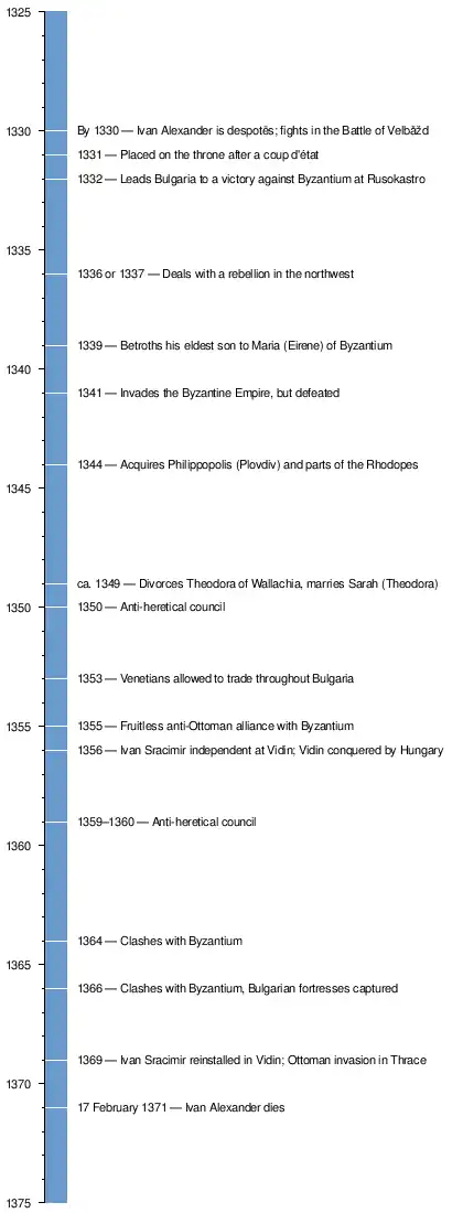 Ivan Alexander (Bulgarian: Иван Александър, transliterated Ivan Aleksandǎr,[1] pronounced [iˈvan ɐlɛkˈsandɐr]; original spelling: ІѠАНЪ АЛЄѮАНдРЪ),[2] also sometimes anglicized as John Alexander,[3] ruled as Emperor (Tsar) of Bulgaria from 1331 to 1371,[4] during the Second Bulgarian Empire. The date of his birth is unknown. He died on 17 February 1371.[5]