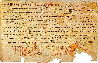 Ivan Asen's conquests secured the Bulgarian control of the Via Egnatia (the important trade route between Thessaloniki and Durazzo).[42] He established a mint in Ohrid which began to strike gold coins.[46] His growing revenues enabled him to accomplish an ambitious building program in Tarnovo.[40] The Church of the Holy Forty Martyrs, with its facade decorated with ceramic tiles and murals, commemorated his victory at Klokotnitsa.[40] The imperial palace on the Tsaravets Hill was enlarged.[47] A memorial inscription on one of the columns of the Church of the Holy Forty Martyrs recorded Ivan Asen's conquests.[38][19] It referred to him as the "tsar of the Bulgarians, Greeks and other countries", implying that he was planning to revive the Byzantine Empire under his rule.[43] He also styled himself emperor in his letter of grant to the Vatopedi Monastery on Mount Athos and in his diploma about the privileges of the Ragusan merchants.[48] Imitating the Byzantine emperors, he sealed his charters with gold bulls.[49] One of his seals portrayed him wearing imperial insignia, also revealing his imperial ambitions.[50]
