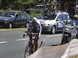 Stage 11 was a long and flat[9] individual time trial where Basso finished in second place, losing only to former two-time world time trial champion Jan Ullrich, beating riders like the Italian national time trial champion Marco Pinotti. During the last week of the 2006 Giro, Basso beat his main rivals for the general classification, and won stages 16 and 20 along the way. His victory in Stage 20, where he rode to a solo victory on the final ascent into Aprica after riding away from rival Gilberto Simoni, was notable when he, already sure of his victory, pulled out a picture of his newly born son Santiago, and held it aloft as he crossed the finish line. Santiago Basso had been born the previous day, and Basso had not yet seen his son in the flesh, having been given the picture only hours before the stage started. When rival Simoni rolled across the line over a minute behind Basso, he was clearly upset at being beaten and made a remark that Basso's dominance at that year's Giro was "extra-terrestrial."[10] Basso eventually finished 9 minutes 18 seconds up on the second placed rider, José Enrique Gutiérrez, the largest margin of victory in the Giro d'Italia since 1965. After the last stage of the race, Basso declared that he would continue along his pre-season plan to also ride the Tour de France.