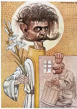 Cankar was an influential author already during his lifetime. His works were widely read and Cankar was the first author in Slovene who could make a living exclusively from writing.[26] He became even more influential after his death. Due to his insistence on the cultural and national specificity of the Slovene people, Cankar became the referential figure for the young generations of Slovene intellectuals who rejected the centralistic and unitaristic policies of the Serb political elite in the Kingdom of Yugoslavia. In the early 1920s, a group of young Catholics, mostly of Christian Socialist convictions, took the title of one of Cankar's minor novels, Križ na gori (Cross on the Mountain), as the name of their journal. The group, known as the "Crusaders" (Križarji), became the focal point in the emergence of the Christian left in Slovenia in the 1920s and 1930s.[27][28]