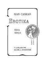 Cankar started as a poet. He published his first poems already as a teenager in the liberal literary magazine Ljubljanski zvon. In Vienna, he frequented a group of young Slovene artists and authors, among whom were Oton Župančič, Fran Eller and Fran Govekar, who introduced him to the modernist currents of European literature. In 1899, Cankar published his first collection of poetry under the title Erotika. Decadentist and sensualist influences were evident and the then bishop of Ljubljana Anton Bonaventura Jeglič was so scandalized by the book that he bought all the copies and ordered their destruction.[19] Another edition was issued three years later, but by that time Cankar had already abandoned poetry and moved to politically-engaged literature.[7] In 1902, he wrote his first play Za narodov blagor (For the Welfare of the Nation), which was a violent parody of the liberal nationalist elite in the Slovene Lands, especially in Carniola.[20] The same year, he published the short novel Na klancu (On the Hill), in which he described the misery of the small rural proletariat and the poor material and spiritual conditions of the common people. The novel, which still showed strong naturalistic features, combined with allegorical symbolism and an unusual, biblically inspired style, gained him widespread recognition.