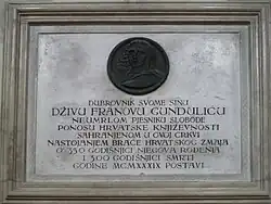Gundulić was born in Dubrovnik into a wealthy Ragusan noble family (see House of Gundulić) on 8 January 1589. Son of Francesco di Francesco Gundulić (Frano Franov Gundulić, senator and diplomat, once the Ragusan envoy to Constantinople and councilor of the Republic to the Pope Gregory VIII) and Dživa Gradić (de Gradi). He received an excellent education. He probably studied the humanities with the Jesuit Silvestro Muzio and philosophy with Ridolfo Ricasoli and Camillo Camilli,[5] who in late 1590 had been appointed rettore delle scuole e professore di umane lettere in Ragusa. After that he studied Roman law and jurisprudence in general,[6] where he held numerous offices for the Great Council of the Republic. In 1608, when he was nineteen, he became a member of the Veliko vieće (Great Council). Twice, in 1615 and 1619, he held the temporary function of knez (commissary or governor) of Konavle, an area southeast of the city.