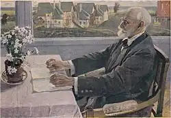 Conscious until his final moments, Pavlov asked one of his students to sit beside his bed and to record the circumstances of his dying. He wanted to create unique evidence of subjective experiences of this terminal phase of life.[25] Pavlov died on 27 February 1936 of double pneumonia at the age of 86.[26][27] He was given a grand funeral, and his study and laboratory were preserved as a museum in his honour.[8] His grave is in the Literatorskie mostki (writers' footways) section of Volkovo Cemetery in St. Petersburg.