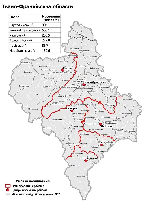 Ivano-Frankivsk Oblast (Ukrainian: Івано-Франківська область, romanized: Ivano-Frankivska oblast), also referred to as Ivano-Frankivshchyna (Івано-Франківщина) or simply Frankivshchyna, is an oblast (region) in western Ukraine. Its administrative center is the city of Ivano-Frankivsk. It has a population of 1,351,822 (2022 estimate).[3]
