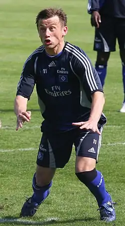 In January 2007, Olić moved to Hamburger SV, playing his first Bundesliga match with them against Energie Cottbus on 31 January.[7] He was signed because Hamburg were in deep trouble, finishing in the relegation zone before the winter break. It worked out in the end, and Hamburg finished seventh, which even acquired them a UEFA Intertoto Cup place, which they eventually won. He scored two goals in the last match in the 2006–07 Bundesliga season against Alemannia Aachen in a 4–0 win. In October 2007, Olić scored a hat-trick in the Bundesliga match against VfB Stuttgart, which Hamburg won 4–1.[8] He was the first player in the club's history to score three successive goals in one half.