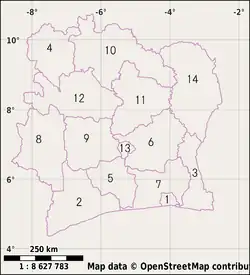 - ^ While Yamoussoukro is the seat of Bélier region, the city itself is not part of the region.