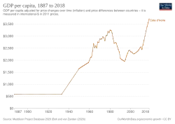 Ivory Coast is a republic with strong executive power vested in its president. Through the production of coffee and cocoa, it was an economic powerhouse in West Africa during the 1960s and 1970s, then experienced an economic crisis in the 1980s, contributing to a period of political and social turmoil that extended until 2011. Ivory Coast has again experienced high economic growth since the return of peace and political stability in 2011. From 2012 to 2023, the economy grew by an average of 7.1% per year in real terms, the second-fastest rate of economic growth in Africa and fourth-fastest rate in the world.[15] In 2023, Ivory Coast had the second-highest GDP per capita in West Africa, behind Cape Verde.[16] Despite this, as of the most recent survey in 2016, 46.1% of the population continues to be affected by multidimensional poverty.[17] As of 2023, Ivory Coast is the world's largest exporter of cocoa beans and has high levels of income for its region.[18] The economy still relies heavily on agriculture, with smallholder cash-crop production predominating.[2]
