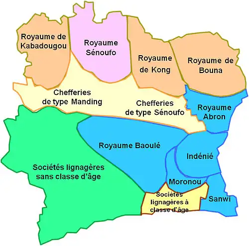 The Baoulé, like the Ashanti, developed a highly centralised political and administrative structure under three successive rulers.[44] It finally split into smaller chiefdoms.[44] Despite the breakup of their kingdom, the Baoulé strongly resisted French subjugation.[44] The descendants of the rulers of the Agni kingdoms tried to retain their separate identity long after Ivory Coast's independence; as late as 1969, the Sanwi attempted to break away from Ivory Coast and form an independent kingdom.[44]