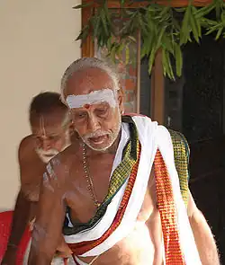 The bathing was considered sufficiently purifying only if it conformed to the rules of madi.[41] The word madi is used by Tamil Brahmins to indicate that a person is bodily pure. In order to practice madi, the Brahmin had to wear only clothes which had been recently washed and dried, and the clothes should remain untouched by any person who was not madi. Only after taking bath in cold water, and after wearing such clothes, would the person be in a state of madi.[43] This practice of madi is followed by Iyers even in modern times, before participating in any kind of religious ceremony.[41]