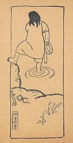 The names Izanagi (Izanaki) and Izanami are often interpreted as being derived from the verb izanau (historical orthography izanafu) or iⁿzanap- from Western Old Japanese 'to invite', with -ki / -gi and -mi being taken as masculine and feminine suffixes, respectively.[2][3][4] The literal translation of Iⁿzanaŋgî and Iⁿzanamî are 'Male-who-invites' and 'Female-who-invites'.[5][6] Shiratori Kurakichi proposed an alternative theory which instead sees the root iza- (or rather isa-) to be derived from isao (historical orthography: isawo) meaning 'achievement' or 'merit'.[7] The etymological origin of the verb is suggested to be a precursor to the Middle Korean lemma yènc- meaning 'to place/put on [the top of]' reconstructed as *yenc-a (place-INF) in Old Korean.[8]