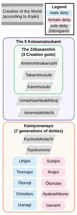 The Kojiki portrays Izanagi and his younger twin sister Izanami as the seventh and final generation of deities that manifested after the emergence of the first group of gods, the Kotoamatsukami, when heaven and Earth came into existence.[9]