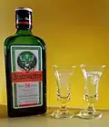 Jägermeister (/ˈjeɪɡərmaɪstər/ YAY-gər-my-stər, German: [ˈjɛːɡɐˌmaɪstɐ] ⓘ) is a German digestif[1] made with 56 herbs and spices. Developed in 1934 by Wilhelm and Curt Mast,[2][3] it has an alcohol by volume of 35% (61 degrees proof, or US 70 proof). The recipe has not changed since its creation,[4] and the drink continues to be sold in a green glass bottle.[5] It is the flagship product of Mast-Jägermeister SE headquartered in Wolfenbüttel, Germany.