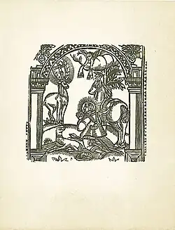 The label on Jägermeister bottles features a glowing Christian cross seen between the antlers of a stag.[15][16] This image is a reference to the two Christian patron saints of hunters: Hubert of Liège and Eustace, both of whom converted to Christianity after experiencing a vision in which they saw a Christian cross between the antlers of a stag.[15][16][17][18]