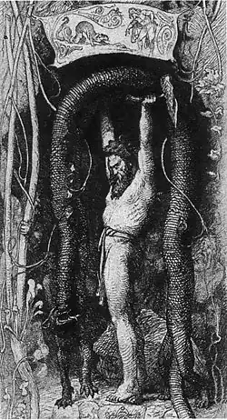 Jörmungandr and Thor meet again when Thor goes fishing with the jötunn Hymir. When Hymir refuses to provide Thor with bait, Thor strikes the head off Hymir's largest ox to use it. They row to a point where Hymir often sat and caught flatfish and where he drew up two whales. Thor demands to go further out to sea and does so despite Hymir's protest. Thor then prepares a strong line and a large hook and baits it with the ox head, which Jörmungandr bites. Thor pulls the serpent from the water, and the two face one another, Jörmungandr blowing atter.[7] Hymir goes pale with fear. As Thor grabs his hammer to kill the serpent, the jötunn cuts the line, leaving the serpent to sink beneath the waves and return to its original position encircling the earth.[7][8] The Eddic poem Hymiskviða has a similar ending to the story, but in earlier Scandinavian versions of the myth in skaldic poetry, Thor successfully captures and kills the serpent by striking it on the head.[8][9]