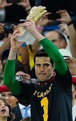 Júlio César was part of the 23 players called by coach Luiz Felipe Scolari to play in the 2013 FIFA Confederations Cup on home soil.[154] He played three matches in Group A and kept two clean sheets; the first in the opening match against Japan (3–0) and the second against Mexico (2–0).[155][156] In the semifinal against Uruguay, Júlio César saved a penalty kick taken by Diego Forlán in the 14th minute. Brazil went to win the match by 2–1, and Júlio César was named man of the match.[157][158] He kept his goal intact in the final as well against Spain as Brazil won 3–0 to claim their 4th title.[159] For his performances he was given Golden Glove award as the best goalkeeper of the tournament; he was also part of the FIFA.com Users' Dream Team.[160] Júlio César received the award while wearing the shirt of Iker Casillas, to make "a tribute for everything he did".[161]